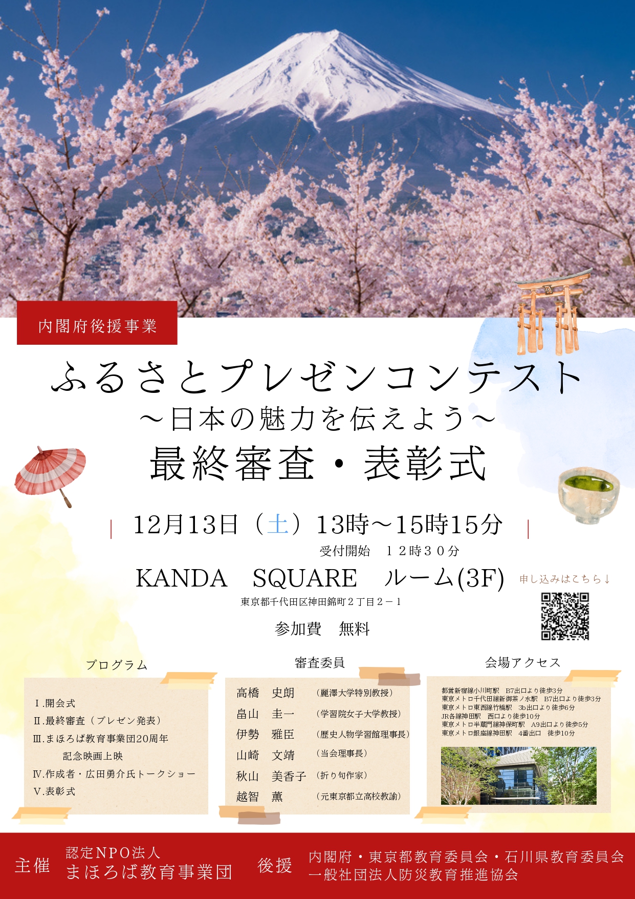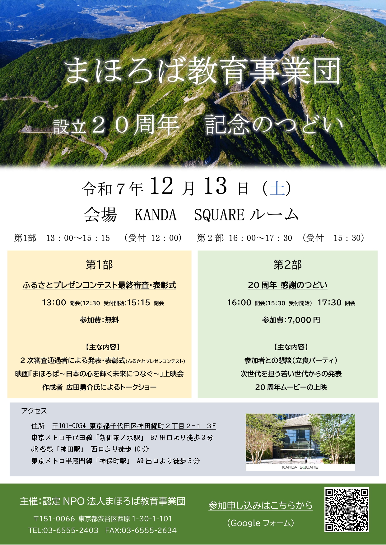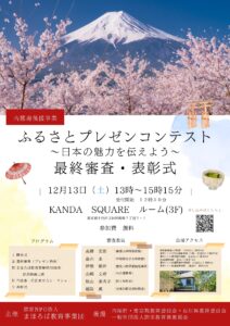 ■開催概要 (1)要 項 ◆第1部 日時:令和7年12月13日(土)13時~15時15分 会場:KANDA SQUARE ルーム(東京都千代田区神田錦町2-2-1 3階) 参加費:無料 ◆第2部 日時:令和7年12月13日(土)15時45分~17時15分 会場:KANDA SQUARE ルーム(東京都千代田区神田錦町2-2-1 3階) 参加費:7,000 円 ※会場アクセス 東京メトロ半蔵門線 神保町駅 A9 出口より徒歩5 分 都営新宿線 小川町駅 東京メトロ千代田線 新お茶ノ水駅下車、B7 出口より徒歩3 分 東京駅より東京メトロ丸の内線に乗車3分「淡路町」下車、B7 出口 徒歩3分 (2)主な内容 ◆第1 部 「ふるさとプレゼンコンテスト 最終審査・表彰式」 1、参加者によるプレゼン発表 2、上映とトークショー 映画「まほろば~日本の心を輝く未来につなぐ~」 広田勇介(写真家、山岳ガイド) 3、表彰式 4、講評並びに挨拶・記念撮影 ◆第2部 「20 周年記念の集い」 1、挨拶(2・3名) 2、乾杯・歓談 3、記念ムービー上映 4、若手からの発表(仮) 5、閉会の挨拶