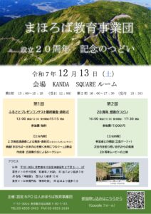 詳細は上記のチラシをご覧ください。 20周年を機に、まほろばの輪がますます広げていきたいと思いますので、 OB・OGの皆様も同窓会の気持ちで、ぜひご参加ください!
